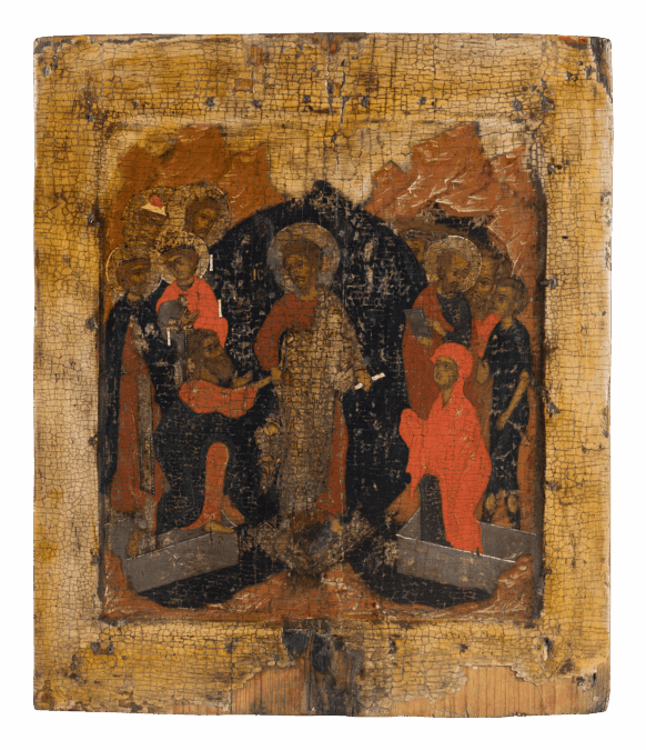 De Anastasis (opstanding) van Christus en de overwinning op het rijk van de dood staan centraal op deze ikoon. Christus, omgeven door een stralende mandorla, vertrapt de poorten van het dodenrijk en trekt Adam aan zijn pols omhoog uit een stenen grafkist. Achter Adam staam de koningen David en Salomo, de profeet Daniël en Johannes de Doper (de Voorloper), die met zijn hand naar Christus wijst en een groep oudtestamentische profeten en voorvaderen aanspreekt. Rechts van Christus staan onder andere Eva, Abel en Mozes.