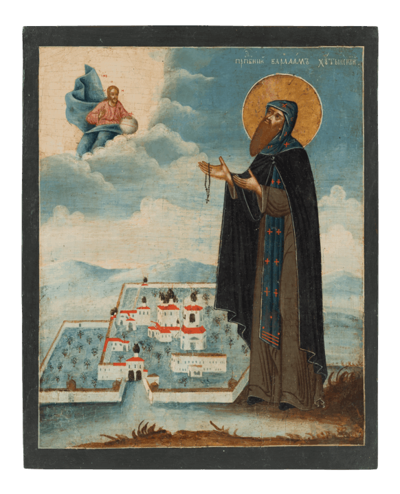Varlaam is hier afgebeeld naast het door hem gestichte klooster – op deze ikoon gesitueerd in een ijzig en besneeuwd winterlandschap.